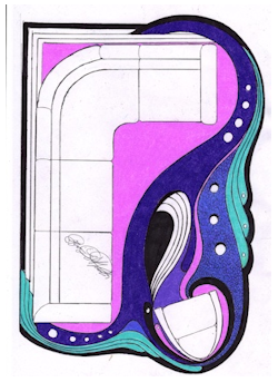 The shape of the chair was incorporated into the final design (actually all designs) chosen by Joe and Carey. The back of the area rug (shown in a picture below) held the border, and was created to allow room for the lamp to sit upon it.