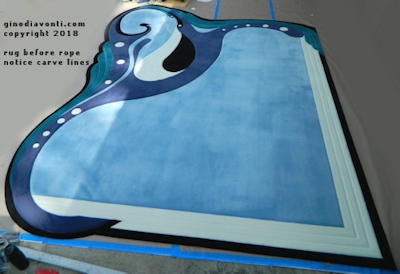 Gino will also add Fine Designers Rope to his rugs, if the Client so chooses. Joe and Carey wanted the rug to incorporate this, and so Gino added black cording to many of the carve lines of the custom rug. It came out stupendous! You can note in one of the photos here, the custom designed area rug before it had the cording added.