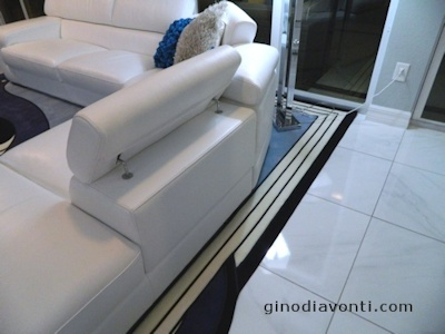 Gino always designs the area rug to have the furniture sit upon it. It helps to stablize the furniture. Gino also believes that since the carpet being ordered is either Fabrica or Masland (or a combination of them both) that his client should receive the most carpet for their money.