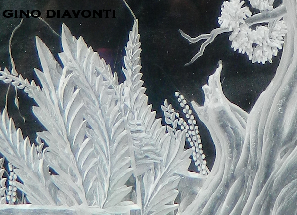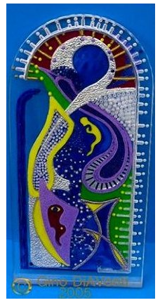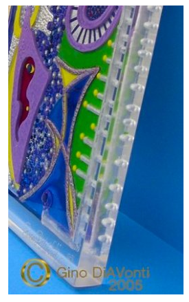 This acrylic piece has been colored up after carving took place. It shows just how lovely adding color can be. Gino worked on the piece for about a month, and then started adding the cathedral-like glass dyes. A really lovely artwork, it now resides in Bonita Springs with it's rightful owner.