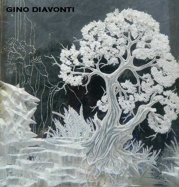 This is an example of Gino's love of carving trees and nature into acrylic. He is not finished with this piece, but when he gets the time, he plans on adding several other layers of carved acrylic panels behind it, to create a depth effect. It will make the forest appear very deep, which is his intention.