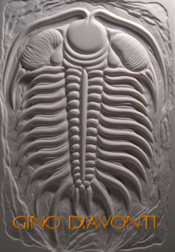 Gino has recently had a Client who has looked for a particular fossil of a very rare trilobite from Morrocco all of his life, and to no avail. This fossil is most usually only found in fragments, and complete, perfect pieces are almost unheard of. Gino showed him what corain's capabilities are with the back lighting effects, and was then hired to complete the task. The carving (seen on left) is so recent, Gino is still doing work on the piece, but expects to be done very soon. The final piece will rest in a lighted glass case on an acrylic stand. The work measures approximately 16 inches by 14 inches.
