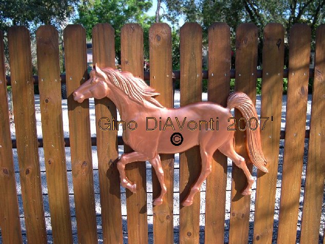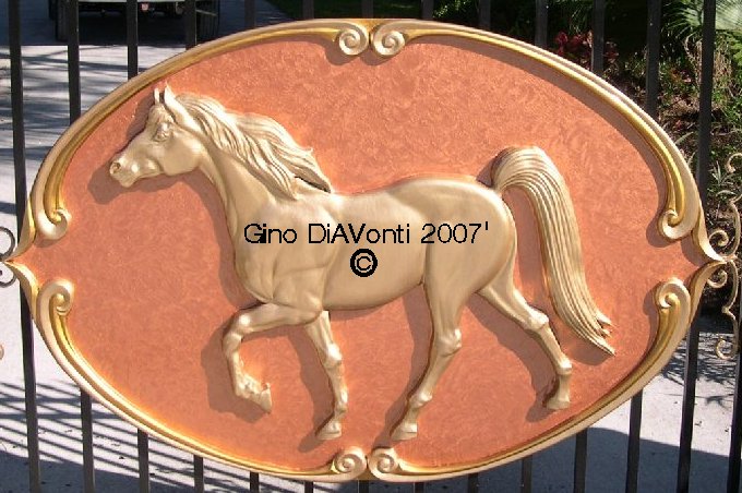 The paints used are metallics of bronze, gold and copper. Lastly, a clear sealer was placed over both to keep out the weather. The project took Gino about one month to complete. The medallion is approximately 3 feet by 3 and 1/2 feet. The light bronze horse that stands on his own is approximately 2 1/2 feet long. Both pictures are clickable for a bigger view.