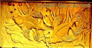 The 4' x 8' Fantastical Goldfish wood panel above was carved in 1990',