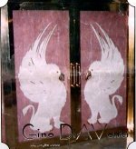 The Griffin doors shown above were made after Hurricane Andrew for an Estate in Coral Gables. They are entrance doors to a Banquet Hall. Both are made of Corian, pink alabaster Avonite, and Brass. The