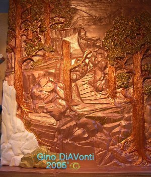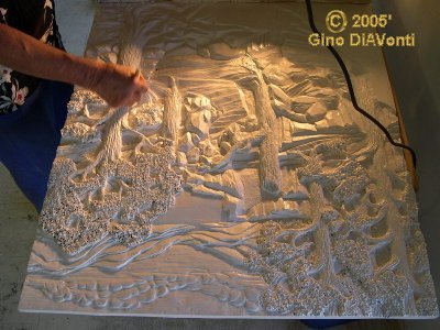 Gino later added the oil colors pthalo green, grumbacher red, cadmium-barium yellow and blue metallic Farb pulver. With these, he painted in the ferns and grasses he'd carved in, and added tiny red & yellow flowers. He also painted the lake.