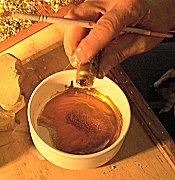 After the copper thoroughly dries, One can begin adding the metal paints to the surface. You will need Linseed oil, metallic pulvers, various sized brushes, paper towels and some glass bowls with lids (or you can cover with glad-wrap) and Paint thinner. Remember, because you will be suspending the pulvers in linseed oil, you have now created an oil−based paint, so drying time rises considerably. You will need to protect the Work from airborne dust for that period.
