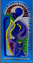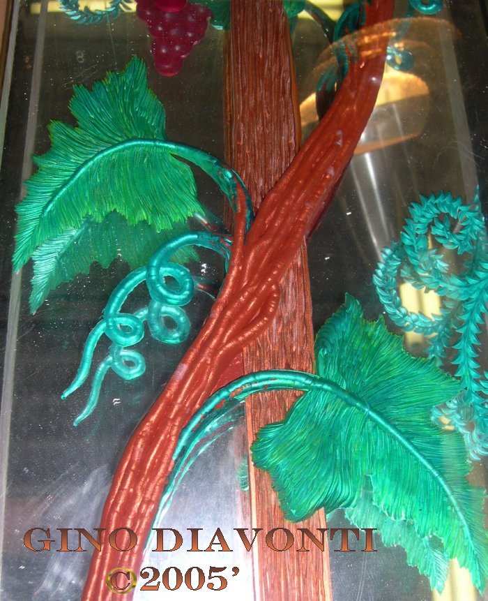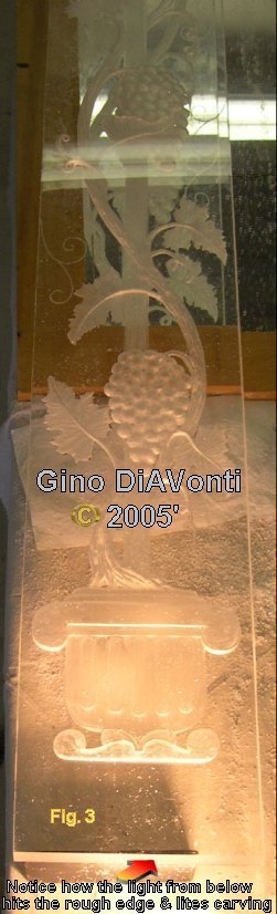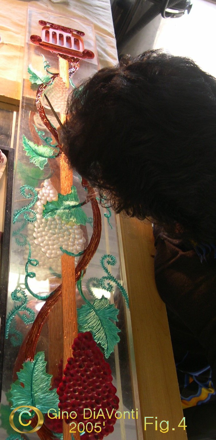 When he has finally finished the carving, he uses a porter cable hand-held jitterbug with various grades of sandpaper to sand both the front and back surfaces of the carving. He then takes a chamois dabbed in polishing compounds to it. This returns it to its' original smooth polished looking finish. (The surface piece becomes scratched as it is being carved, an undesirable effect) Only now can he begin to add the translucent glass dye paints to the Work.