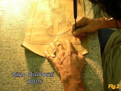 After they were completely drawn up to full-scale, Gino painstakenly takes a few days to poke tiny holes along each line, (Fig 2) using an ice pick that has been honed to a sharp point. The tiny holes will then allow Gino to transfer the drawing to the acrylic by first applying the drawing flush with the acrylic and then spraying black spray paint over it. Notice the carpet padding under the drawing as he pokes the holes; this allows the ice pick to go through the paper and not dull the point nor re-close the holes in the paper.